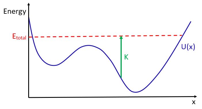 Energy diagrams like the one shown above plot mechanical energy as a function of position. Total energy of a particle consists of potential energy plus kinetic energy. The behavior of a particle can be analyzed as the particle moves in a potential. Depending on the total energy available to a particle, it may have points of stable equilibria (dips) unstable equilibria (peaks) and turning points where the kinetic energy goes to zero.