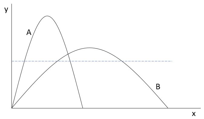 Consider the trajectories of a projectile above. If the initial speed was the same for both trajectories, in which trial would the projectile be moving faster when it crossed the dashed line?