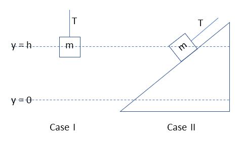 1. Work done by tension against gravity is done in two cases depicted below. In case A, a block of mass m is lifted to a height h. In case B, the block is pulled up a frictionless incline to the same height h. Compare work done against gravity on the block by the rope in the two cases.