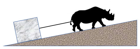 1. A rhinoceros drags a 150 kg marble block up a 14° incline at a steady pace of 3.2 m/s. The coefficient of friction between the ramp and the block is 0.28. What is the power output of the rhino is used to pull the block up the ramp?
