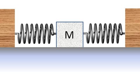 2. Two identical ideal springs are attached at their equilibrium lengths to a 1.4 kg block on a frictionless table as shown. The block is displaced 4.0 cm to the left by a 2.2 N force and held at rest. What is the spring constant of the springs?