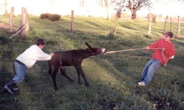 In the image above, the donkey has several forces acting on it. Can you identify them? Since the donkey is not changing its velocity, the net force must be zero.