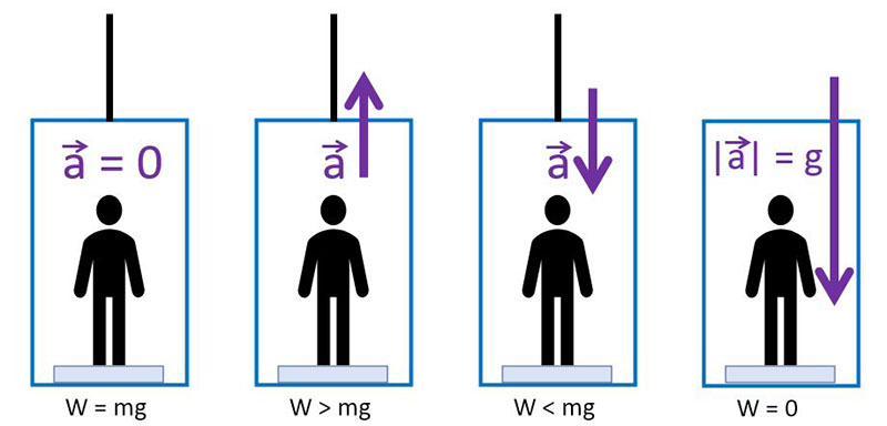 If we define weight as the reading on a spring scale, a person in an elevator that was accelerating upward would weigh more than they would standing on a scale that was at rest with the surface of Earth, or moving at constant velocity. A person in an elevator that was accelerating downward would with more than mg, and a person in freefall would be weightless.