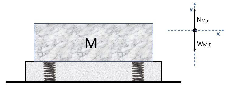 The magnitude of the force of a spring depends on how far it is compressed or expanded: F = -kx. The spring constant k is a measure of the stiffness of a spring. We can utilize this to make a spring scale to measure the weight of an object of mass M. The normal force exerted upward on the object of mass M is equal and opposite of the weight. A hanging spring scale works the same, except that it measures the tension pulling down on the spring as the weight.