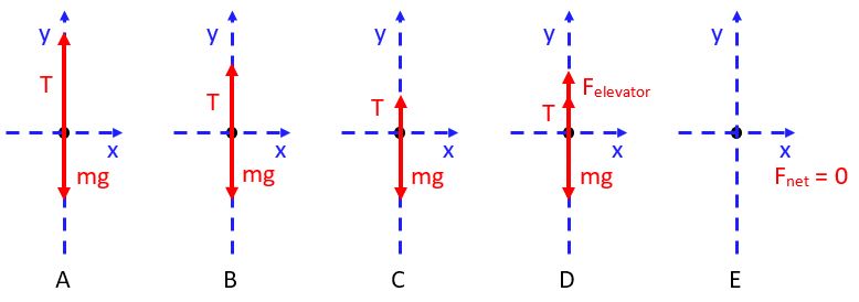 1. An elevator is suspended by a cable. The elevator is moving upward and slowing down. Which free-body diagram is correct for this situation?