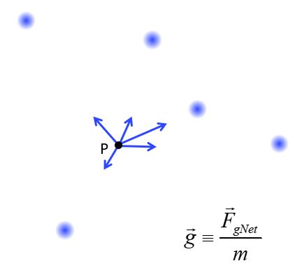 We can also define the gravitational field. It is related to the gravitational force, but it is different in a fundamental way. A field is defined at every point in space. We can define a gravitational field at a point P even if there is no massive particle located there. The gravitational field g is a vector quantity, defined as the net gravitational force divided by mass m. The direction of the field is the direction of the gravitational force that a small test mass would feel if it was placed at P. The gravitational field has units of acceleration.