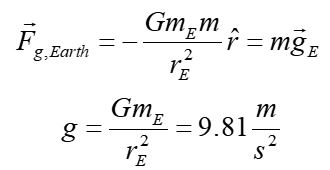 The gravitational force between a point with mass m and Earth, if the point is near the surface of Earth, is defined using the mass and radius of Earth as shown. We use a lower case g to denote the acceleration due to gravity on a massive particle near the surface of Earth.