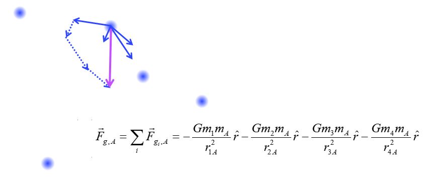 The total gravitational force on a massive particle is the vector sum of all of the forces from other massive particles. As seen in this example, the net gravitational force may not even point in the direction of any one of the particles.