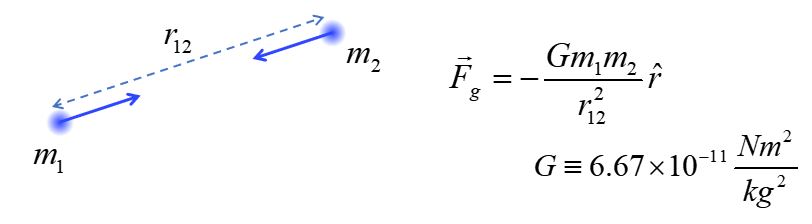 The gravitational force between two massive particles is defined as the product of the masses divided by the square of the distance between them. The force is negative because it is attractive. The smaller the distance between the particles, the stronger the force. We use the gravitational constant G to obtain the correct units and also to set the scale relative to other kinds of force like the electromagnetic force. The r-hat unit vector gives the direction of the force.