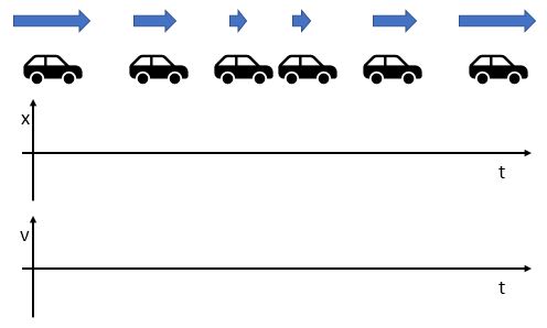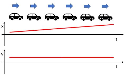 Strobe diagrams can be used in conjunction with position vs. time and velocity vs. time graphs to provide multiple ways of representing the same motion. Here, the spacing between the cars is the same throughout the strobe diagram. The lengths of the arrows above the car depict the magnitude of the velocity, or the speed. The correlating x vs. t graph shows a constant change in position, while the v vs. t graph shows constant positive velocity.
