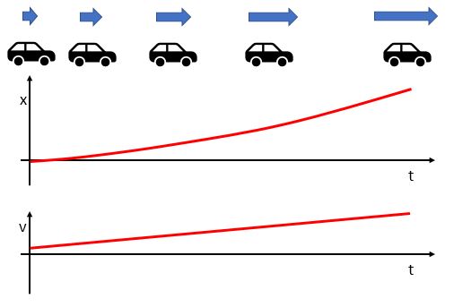 This strobe diagram shows increasing spacing for the car, so it must be speeding up. The velocity vs. time graph shows a constantly increasing positive speed. The corresponding position vs. time graph is parabolic with upward concavity. This car is moving away from the origin, since the x value is getting larger with time. The sign of the velocity is determined by the direction of the motion.