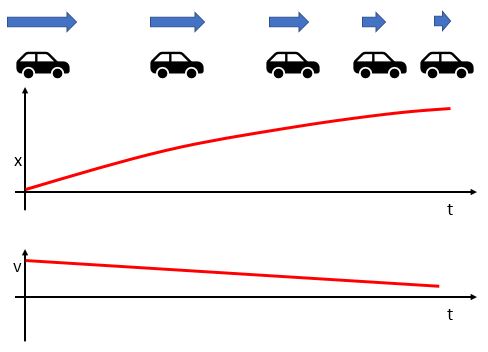 This car is moving in the positive direction and slowing down at a constant rate. Its velocity vs. time graph shows positive velocity with a constant negative slope. The corresponding x vs. t graph is positive and increasing, and concave down. Notice that the slope of the x vs. t graph is decreasing as the v vs. t graph decreases in value.