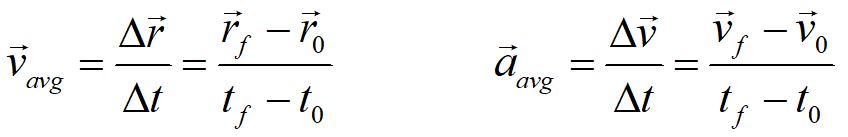 We define the average velocity as the displacement (change in position) divided by the change in time, and the average acceleration as the change in velocity over the change in time.