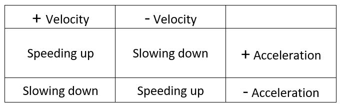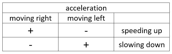 If an object is moving right and slowing down or moving left and speeding up, the acceleration is negative.
