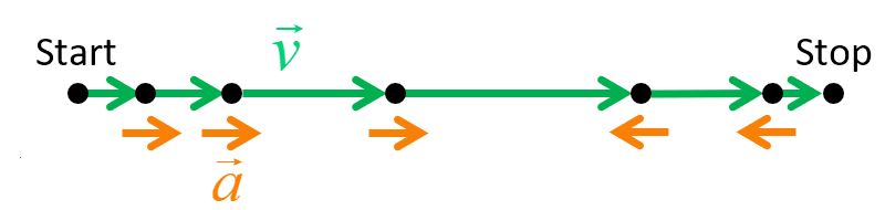 We can use strobe diagrams to depict velocity and acceleration of a particle in motion. Again, the length of the vector depicts magnitude. This example illustrates a particle starting from rest, speeding up and then slowing down and stopping. Note that the velocity arrows all point to the right, indicating that the particle is moving in the same direction from start to stop. The acceleration arrows point to the right while the particle is speeding up and to the left while the particle is slowing down.