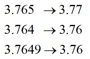 For example, 3.765 rounds to 3.77 because the value after the 6 is at least 5. 3.764 does not round up because that value is 4. Also, 3.7649 does not round up because that value is 4.