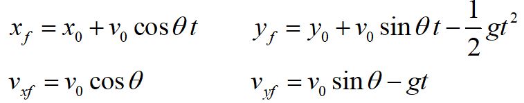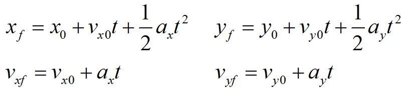 The general kinematics equations for constant acceleration are identical to those for one dimensional motion, only now we consider the vector equations in two directions.