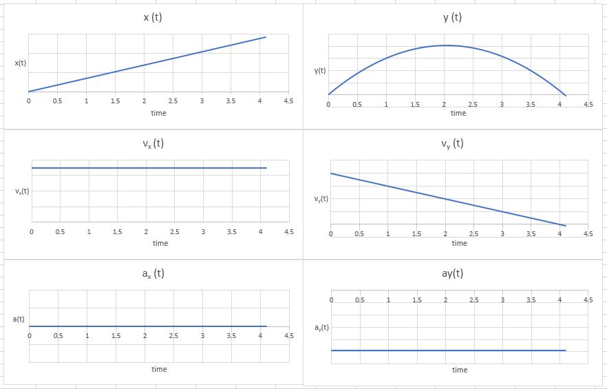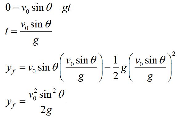 We see that the y-velocity goes to zero at the top of the trajectory. We can use v(t) equation to solve for that time, and calculate yf at that time to see how high the particle will go.