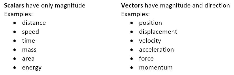 A vector is a mathematical construction that describes an quantity that has a direction as well as a magnitude. A scalar, by comparison, has only magnitude. Some common scalars and vectors are listed in the table below.