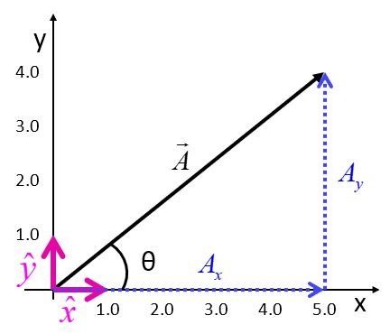 Here, we are really just using the Pythagorean theorem to relate the magnitude of the vector to the magnitudes of the component vectors Ax and Ay. The unit vectors x-hat and y-hat are vectors defined to have magnitude 1, pointed in the directions of the axes.